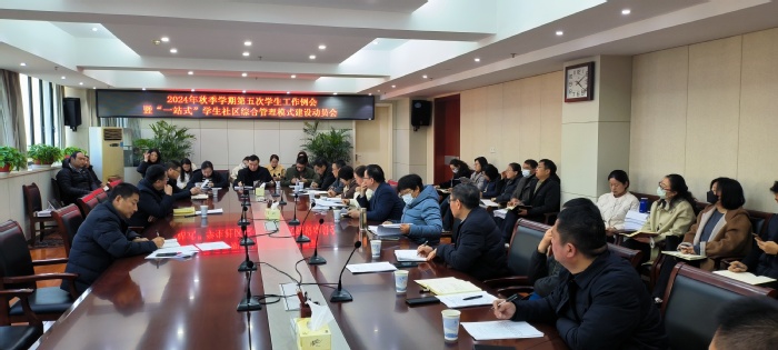 为部署期末学生工作,谋划2025年“一站式”学生社区建设工作,1月6日下午,学校召开秋季学期第五次学生工作例会暨“一站式”学生社区综合管理模式建设动员会。相关职能部门负责人,各学院党委书记、副书记、学工办负责人,各物业公司负责人参会,会议由学生处处长丁增云主持。