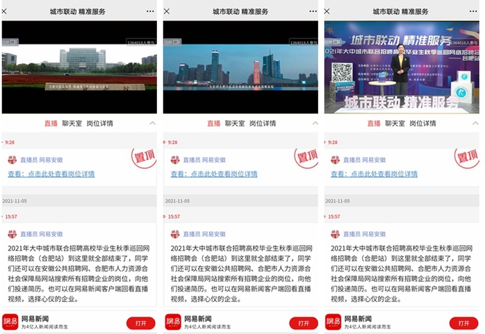 为深入贯彻党中央、国务院关于促进高校毕业生就业创业决策部署,积极落实党史学习教育“我为群众办实事”实践活动要求,11月5日,由合肥市人社局、合肥学院、安徽省人才服务中心等主办,2021年大中城市联合招聘高校毕业生秋季巡回网络招聘会(合肥站)圆满举行。按照疫情防控要求,本次招聘会采取网络直播的形式开展。