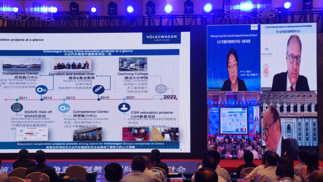 Lou Yi, Seniordirektorin des Volkswagen-Instituts (China) und der Abteilung für Unternehmenskultur und Kommunikation, hielt einen Vortrag mit dem Titel „Überblick und Ausblick der Kooperationsprogramme mit den chinesischen Hochschulen von Volkswagen Group“. Sie gab einen kurzen Überblick über die Bildungskooperationen der Volkswagen Group China, die dualen Bildungsprogramme in der Provinz Anhui und die Entwicklung und Besonderheiten des gemeinsam mit der Universität Hefei errichteten „Volkswagen-Instituts“.