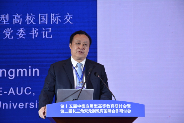 Prof. Dr. Cai Jingmin, Vorsitzender der Vereinigung für internationalen Austausch der anwendungsorientierten Hochschulbildung der Chinesischen Bildungsvereinigung für internationalen Austausch, gab einen Vortrag mit dem Titel „Überlegung zur hochwertigen Entwicklung von anwendungsorientierten Hochschulen in China“. Er war der Meinung, dass die lokalen Hochschulen die Entwicklung mit ihren Eigenschaften fördern und die Umwandlung mit ihren Dienstleistungen anstreben sowie den marktorientierten Status des Hauptteils manifestieren sollten. Um eine qualitativ hochwertige Ausbildung anwendungsorientierter Talente zu verwirklichen, ist es notwendig, mit dem internen Aufbau eines Ausbildungssystems zu beginnen. Er erörterte die folgenden Themen: Betonung der anwendungsorientierten Ausrichtung der Hochschulen, Hervorhebung der bedarfsorientierten Berufsstruktur, Förderung der Ausbildungsform der tiefgreifenden Integration von Industrie und Bildung, Vertiefung des Lehrplansystems der modularen Unterrichtsreform, Umsetzung des Lehrmechanismus des „lernzentrierten Konzepts, Aufbau der „doppelt kompetenten“ Lehrkräfte und Förderung „zweier offener“ Ressourcen.