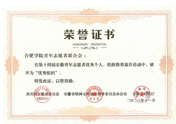 近日,由团省委、省文明办、省民政厅联合开展的第十四届安徽省青年志愿者“优秀组织”“优秀个人名单公布,我校青年志愿者联合会获评“安徽省青年志愿者优秀组织”,经济与管理学院张昕雨同学获评“安徽省青年志愿者优秀个人”。
